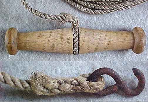 The iron hook at the end of the hemp lanyard was