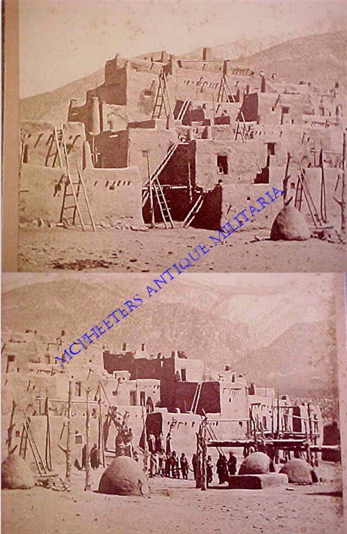 IMPERIAL SIZE CABINET CARD OF LOS PUEBLOS DE TAOS – ca. 1878 IMAGE BY BYRON H. GURNSEY RECORDED BY THE LIBRARY OF CONGRESS:  A very collectable cabinet card in the desirable “Imperial” size, this ca. 1878 view of the Taos Pueblo in New Mexico captures the dwellings before they were altered by increased traffic and later additions.  Featuring the beehive ovens, cedar pole ladders and some of the occupants in their native finery, this image captured one of the most iconic views of the Navajo pueblos.