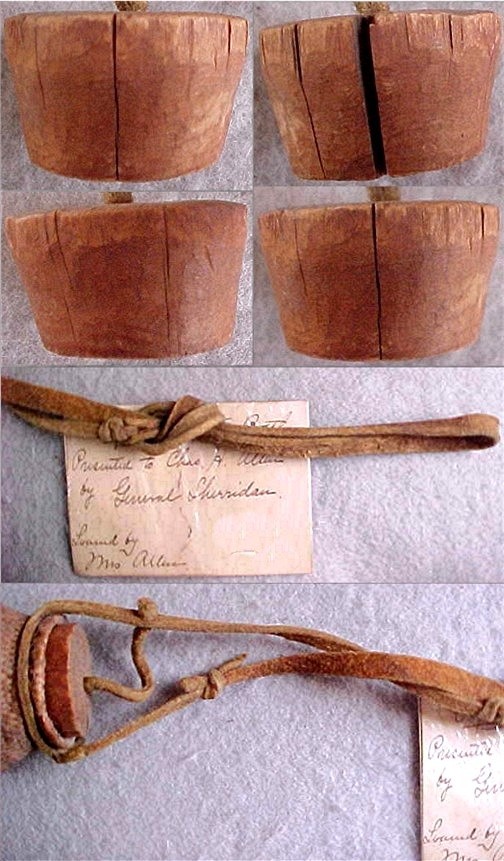 Tied to the buckskin strap is a handwritten card
